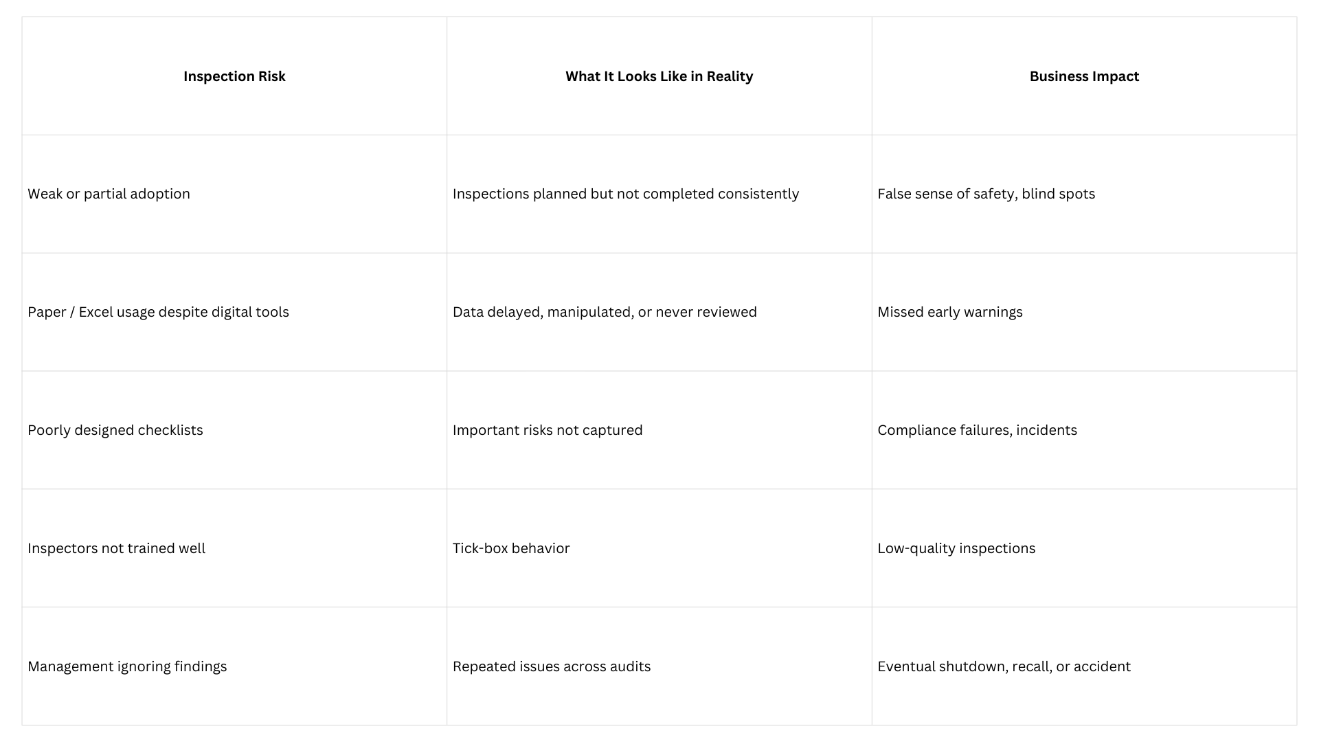 It is deceptive because organizations often believe their inspection management system is working, while silent gaps continue on the ground.